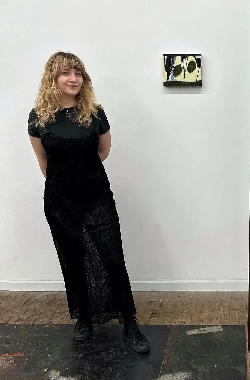 Eleana Daniel is an oil painter based in Chicago. She holds a BFA in Graphic Design from Columbia College Chicago. After an almost decade-long career in advertising as an art director she returned to painting in 2019. Eleana received her MFA in Painting and Drawing at the School of the Art Institute of Chicago in 2024, where she taught introductory painting as a teaching fellow after completing her degree. Eleana’s work has been featured at Co-Prosperity Sphere, Oliva Gallery, The Plan, Woman Made Gallery, Color Club, and most recently at the inaugural Door County Contemporary art fair where she was chosen as Critic’s Pick by Michelle Grabner. She has participated as an artist in residence at the Poor Farm in Manawa, WI and at Trillium Arts of Mars Hill, NC. Eleana has also been the curator of mozart house, a series of DIY group art shows, and a volunteer graphic designer for Comfort Station Logan Square.