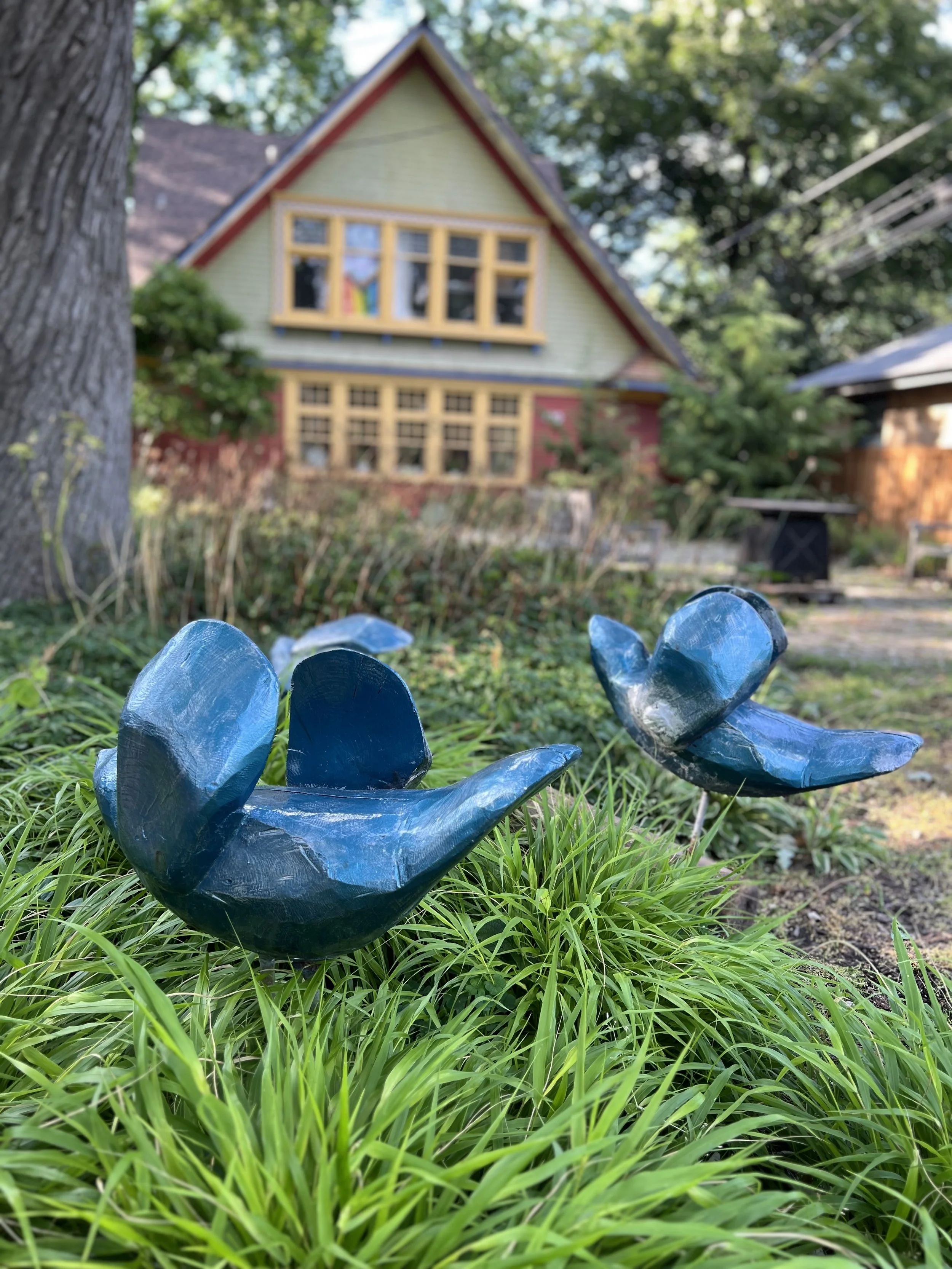 Flow in the courtyard of the historic Oak Park Art League, that thrives through contemporary artistic statements, transforms a gardenscape into a coral reef to remind us of our connection to ocean-life. Even in the Midwest our emissions and plastic waste affects the ocean daily.These manatees and ocean forms resemble flight and perching while swimming amidst the floral and botanic flora to remind us of life forms that existed before our Athropocene era of interruption. Carved from wood, cast in resin and painted with shimmering automobile paint, these life forms are translated into the most permanent material: Resin-plastic. It is dichotomous with the wood carved surface that glistens with man-made permanence to reflect and offer contemplation to our translation of nature into man-made everlasting materials. Just as the botanical tended garden is transformed into the likeness of a coral reel by the Flow of ocean life, the motion can be within air as flight or water as flow through a natural life-forms.