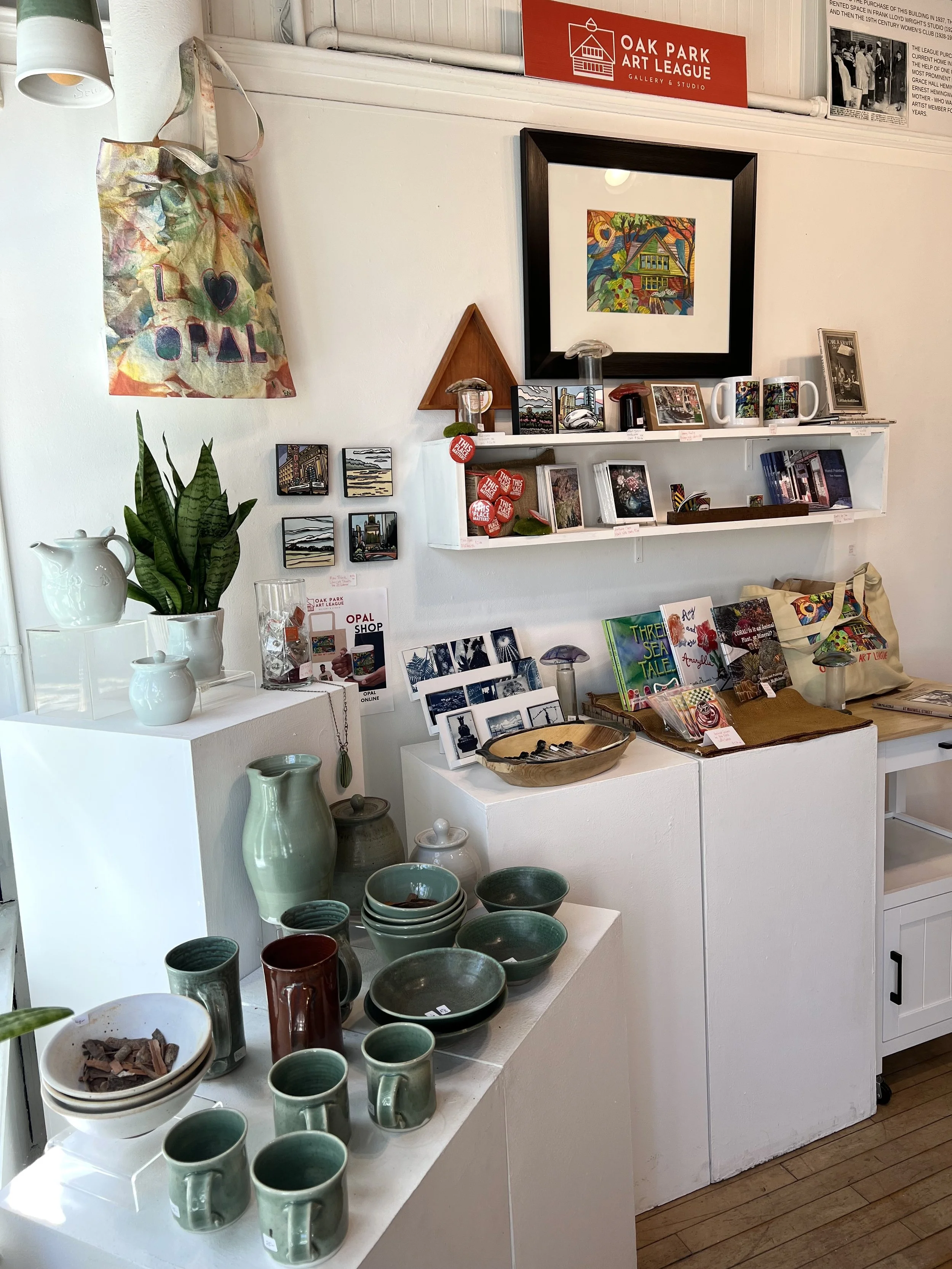 Come shop in person in a new gift shop tucked in the corner of the Carriage House Gallery and filled with original handmade art and objects created locally. Discover new OPAL designs on swag you can wear and use to spread the word about the Oak Park Art League and help raise funds for our beloved organization.